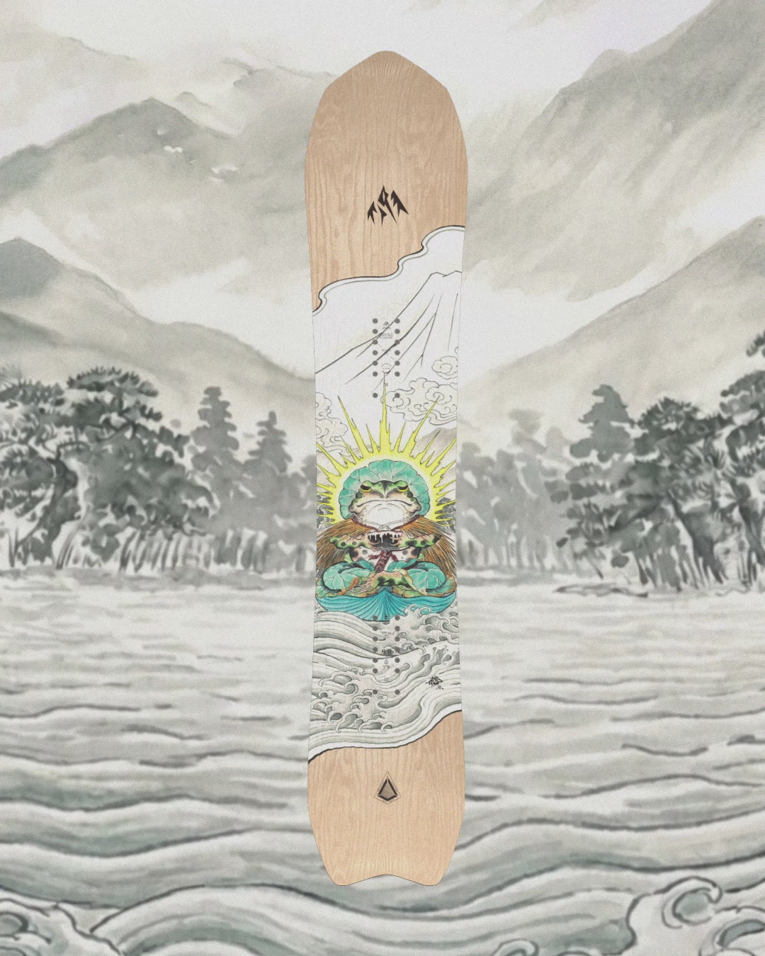 The design unfolds like a hanging scroll, with a scene that runs from the summit of Mt. Fuji to the sea. At the center sits the frog, whose Japanese name, kaeru, doubles as the word for “to return,” making it a symbol of safe passage and good fortune in the mountains.